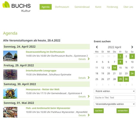 Events, die in der Online-Agenda eingetragen sind, erscheinen automatisch* in der Kulturagenda des Buchser Boten, einer Zeitschrift, die von der Gemeinde fünfmal jährlich an alle Buchser Haushalte verschickt wird. Sie müssen nichts unternehmen.